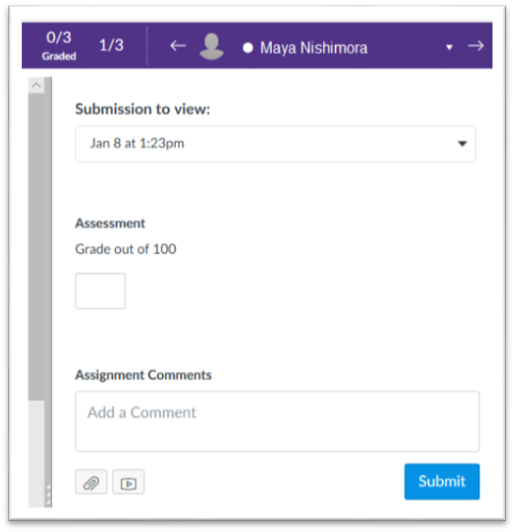 - The student’s submission for the assignment loads into the left panel. View the student’s submission, including uploaded video and/or comments.